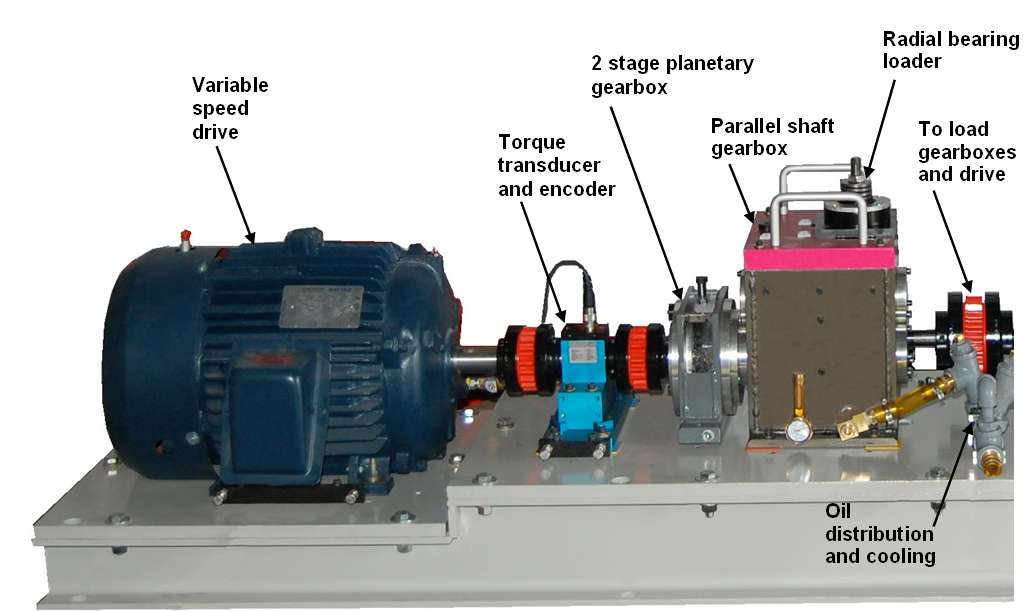 直齒圓柱齒輪或斜齒輪的表面磨損,裂齒,缺齒牙缺失的影響故障,如可以證明,誘導(dǎo)。滾動(dòng)軸承的故障,如內(nèi)圈,外圈,將球破壞也可以被納入。可調(diào)游隙的研究齒隙是可能的:增加間隙量沒有重大的后果,并減少齒隙可以導(dǎo)致結(jié)合和/或過高的操作溫度。傳動(dòng)系統(tǒng)不對(duì),也可以有意引進(jìn)的DPS。這些故障中的任何一種可以被添加到傳動(dòng)系的一個(gè)在一個(gè)時(shí)間,或同時(shí)研究斷層間相互作用。扭轉(zhuǎn)和徑向載荷可應(yīng)用于研究損壞簽名或傳播扭轉(zhuǎn)載荷被施加在齒輪和/或軸承:經(jīng)由10的HP可變頻率的AC驅(qū)動(dòng)器與一個(gè)可編程的,用戶定義的速度分布;和徑向載荷被施加軸在平行變速箱。隨著的可編程負(fù)載驅(qū)動(dòng),負(fù)載波動(dòng)可以應(yīng)用于模擬現(xiàn)實(shí)生活中加載條件。