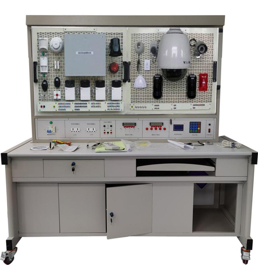 LGN-ZNF02型 安全防范與小區管理實訓裝置采用實訓臺架和網孔板結構,桌面為高級防火防水板,耐磨高密度板,結構堅固,配有常用電源控制柜,能對各系統進行供電、接線、調試運行和維護實訓和考核;模擬實際工程環境,實現智能樓宇設備接線、系統調試、物業運營維護等多方面實訓要求。桌子下面用于放置工具、存放資料等,實訓桌還設有四個萬向輪和四個固定調節機構,便于移運和固定,有利于實訓室布局。本系統控制電源部分全部采用實物,智能考核控制屏、控制臺輸出多種電壓電源、供實訓模塊使用、電腦軟件系統等組成;系統設備將視頻監控、樓宇對講及門禁、防盜報警和巡更系統作為活動模塊,根據課程的不同,將活動的模塊固定到實訓臺上進行實訓;系統不用時,可將模塊放入固定倉儲位置。