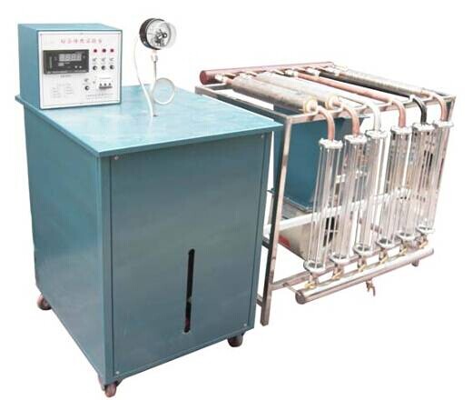 實驗臺由電熱蒸汽發生器、一組表面狀態不同(光管、涂黑、鍍鉻、管外加翅片以及兩只用不同保溫材料保溫)的六根銅管、配汽管、冷凝水儲水器(可計量)及支架等組成。強制通風時,配有一臺可移動的風機,用它來對管子次風。因而,實驗臺可以進行自然對流和強迫對流的傳熱實驗。通過實驗,可對各種不同影響傳熱因素進行分析,從而建立起影響傳熱因素的初步認識和概念。