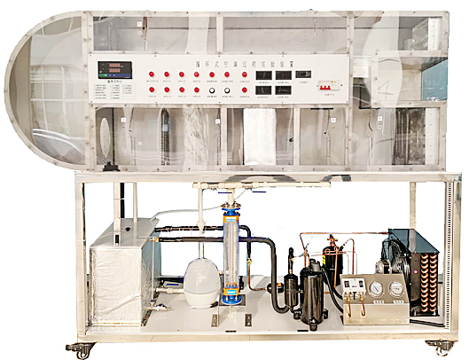 LG-LKR02型 循環式空調過程試驗裝置為《空氣調節》課程實驗教學設備,用它可以模擬不同季節室內和室外的環境和空氣處理調節的方法,進行集中式空調系統不同循環形式的空氣調節實驗。還可以做變風量運行調節實驗和制冷系統的參數測定及其調節實驗。裝置具有透明風管,可直觀地觀察和測試。實驗裝置的結構如圖所示。由空氣循環系統、蒸氣加濕器、一次加熱器、二次加熱器、冷卻器及其冷水機組和相應的測試儀表等組成。可以實現對空氣的加熱、冷卻、加濕和除濕(表冷式和淋水式可互換使用)等處理。利用風雪閥門的調節,可以實現直流式、封閉式(再循環式)和一次回風式、三種不同的循環形式和空氣處理過程。在實驗中,還可以對空氣的溫度、濕度、流量進行測量;并能對加溫器、加熱器的輸入電功率進行測定,從而可以計算各空氣處理過程中的熱量和濕量得失,以及進行熱、濕平衡的分析。本裝置采用電子式數字顯示儀直接檢測點數據組成的測試系統。