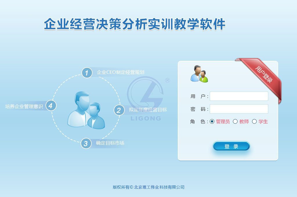 《理工經營決策分析實訓軟件》件注重培養和提升學生企業管理意識,構建虛擬的企業運營環境,讓學生體驗企業CEO制定經營規劃、擬定年度經營目標、確定目標市場、行業競爭等工作。