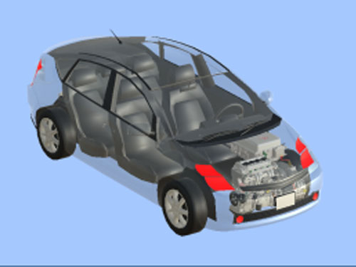 普銳斯混合動力仿真軟件可在3D環(huán)境下展示混合動力系統(tǒng)主要零部件的安裝位置及對應關系,車殼采用透明模式,可通過鼠標進行360度自由旋轉;