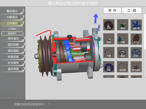 空調壓縮機虛擬仿真教學系統選用空調壓縮機的實物進行1:1的建模,從各大院校對汽車空調壓縮機的教學要求出發,采用三維仿真教學風格,空調壓縮機可以在虛擬仿真環境中360度任意旋轉,全面展示空調壓縮機的結構與工作原理,適用于各大院校教學。