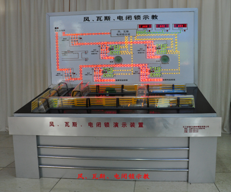 該風電、瓦斯閉鎖示教盤裝置(適合于一、二、三、四級),采用聲、光、電直觀顯示電路,風路流程原理,自動模擬瓦斯檢測,通風系統,煤電站工作原理及各種電器設備,模擬風電、瓦斯電閉鎖系統及閉鎖關系,實現1.0%報警,1.5%斷電的光電演示。