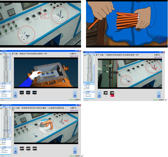 “煤礦特殊工種可視化實操模擬演示系統(tǒng)”學(xué)習(xí)模塊包括煤礦安全理論知識、安全基礎(chǔ)技術(shù)知識、生產(chǎn)專業(yè)技術(shù)知識、生產(chǎn)專業(yè)技能操作、自救互救與創(chuàng)傷急救等內(nèi)容。素材庫綜合利用文字解說、圖形圖像、影音視頻、二三維動畫、虛擬仿真等多種形式,把煤礦一般從業(yè)人員、特種作業(yè)人員、煤礦主要負(fù)責(zé)人及生產(chǎn)管理人員等相關(guān)內(nèi)容,通過圖文并茂、視聽結(jié)合、虛擬互動的方式,將復(fù)雜枯燥的知識點通俗生動的表現(xiàn)出來。使學(xué)習(xí)內(nèi)容有形有聲有色,具有很強(qiáng)的直觀性。
