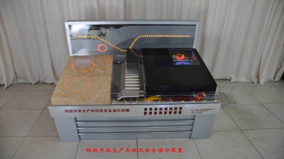 LG-MZC03型 綜采工作面及頂板管理安全演示裝置直觀反映出綜采工作面生產工藝、巷道布置、通風系統、綜合防塵、隔爆設施、瓦斯抽放、瓦斯監測、運輸系統,利用聲、光、電、機械傳動技術顯示工藝流程及頂板巖層的移動及應力分布。直觀體現割煤、移架和推溜。通過支架的移動,展現初次放頂、初次來壓、周期來壓、工作面前后方應力的分布形態,上覆巖層的移動特征及垮落帶,裂隙帶、沉降彎曲帶“三帶”分布規律和地表沉降規律。利用聲、光、電、機械傳動顯示工藝流程。