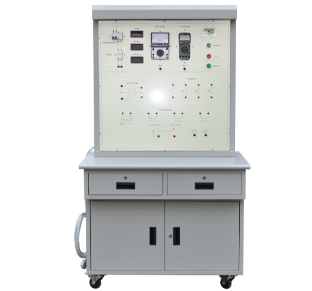 (1)實訓臺主體部分采用全鋼結構,鋼板亞光噴塑,美觀耐用,臺面采用鋁塑板印制而成,整個實訓臺由漏電保護開關、熔斷器、開關電源、數顯計時器、智能刷卡啟動電路板、單繞組變壓器、多繞組變壓器、交流接觸器、數字電壓表、數字電流表、指針萬用表、數字萬用表、照明日光燈、帶鎖開關、按鈕開關、負載電阻和安全接線柱等組成。
