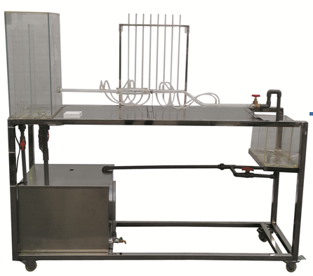 蓄水箱、水泵、有機玻璃實驗水箱、有機玻璃計量水箱、刻度標尺、秒表、玻璃溫度計、測壓管、閥門、不銹鋼框架。