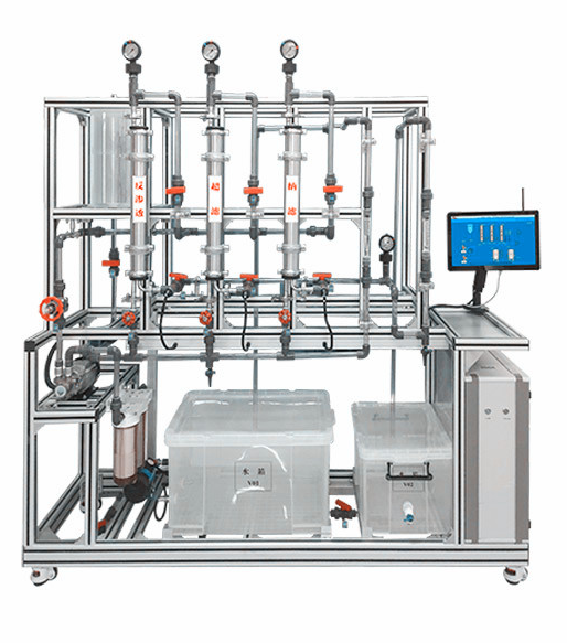 出水槽、原水槽、高壓泵、離心泵、預(yù)過濾器、反滲透膜組件、納濾膜組件、超濾組件、微濾膜組件、壓力表、液體流量計、壓力控制器、電導(dǎo)率儀、管路、閥門、高品質(zhì)鋁合金型材框架。