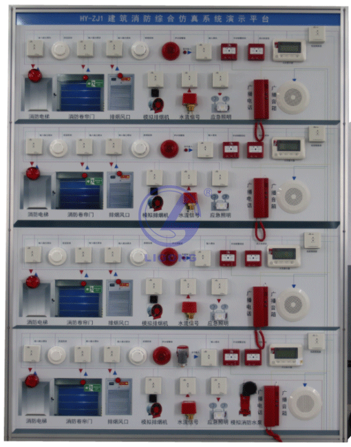 定制展示架由工業(yè)鋁型材制作、感煙探測器、感溫探測器、聲光警報器、火災顯示盤、模擬消防電梯迫降模塊、應急照明及疏散指示標志、防排煙系統(tǒng)組件、消防應急廣播模塊及揚聲器、消防電源強切、繼電器、按鈕、蜂鳴器等。實現(xiàn)火災自動報警、聯(lián)動控制建筑物防排煙系統(tǒng)、消防噴淋泵、消防栓系統(tǒng)泵、電梯迫降、應急照明疏散指示、電切、防煙樓梯間模擬演示功能,立體化實操教學設備。配置萬向輪、航空插頭插座、工業(yè)插頭插座,可與其他設備快速組合安裝。