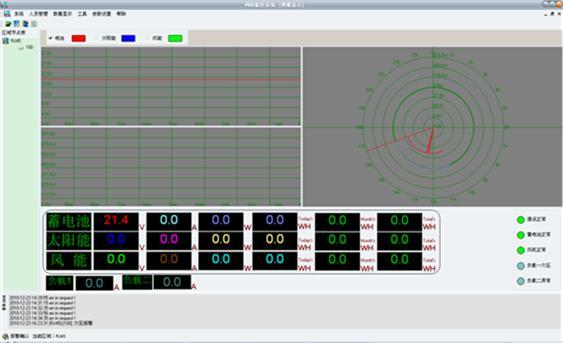 (2)顯示內容:蓄電池電壓、風機電壓、光伏電壓、風機電流、光伏電流、風機功率、光伏功率,能量模擬圖,當前風速(米/秒),當前風向(度),當前風力資源平估。