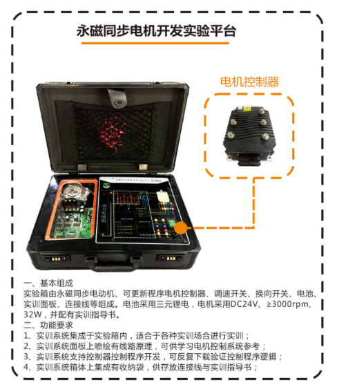 實驗箱由永磁同步電動機、可更新程序電機控制器、調速開關、換向開關、電池、實訓面板、連接線等組成。電池采用三元鋰電,電機采用DC24V、≥3000rpm、32W。