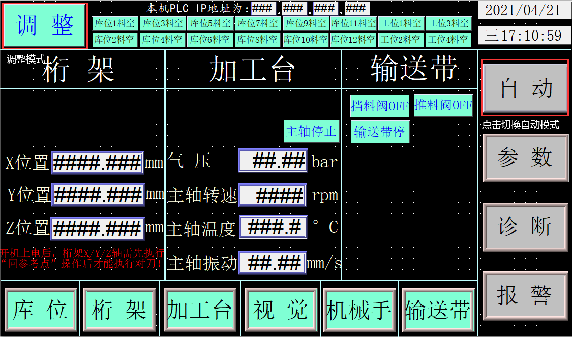 7.設備運行狀態監測:網關實時讀取堆垛機、加工臺、機械手、傳送帶等設備的運行狀態及加工主軸的轉速、溫度、振動,氣缸壓力等參數,并顯示,同時上傳到平臺。