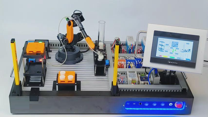 該實訓臺尺寸接近課桌尺寸,僅1000mm × 600mm。使用桌面級工業機器人為執行單元,保證操作安全性。