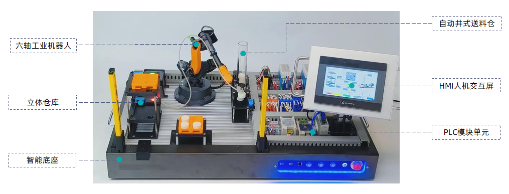 LG-JQRSX型 機器人PLC實訓工作站由桌面級工業六軸機器人、自動井式出料機、PLC控制模塊、立體倉儲單元及HMI人機交互單元組成。