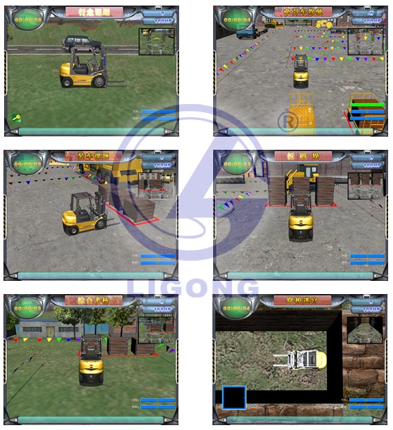 ★裝載機模擬機課題數目共5個:行走、移庫、裝車、平整、打堆。叉車模擬機課題數目共6個:行走、牽引車、拆垛碼、裝車、綜合考核、娛樂教學。