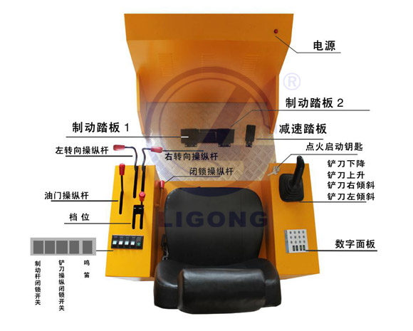 3.擁有左右行走踏板、減速踏板、鏟刀控制手柄、操縱箱、手拉式方向總成、檔位控制器、檔位閉鎖桿、油門拉桿、高集成數據電路板及各種功能調節組件等組成,操作時在視屏上顯示輸出與操作相對應的逼真三維場景并伴有相應語音提示;